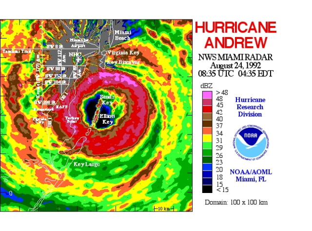 We missed Andrew's eye by 2 1/2 miles on the north side, in S.Miami-Dade, but saw my strongest winds----NHC survey pinned gusts of 175 mph at our locale; which was 40 ft. from this image. Pressure in eye was 922 mb, we recorded 942 mb.