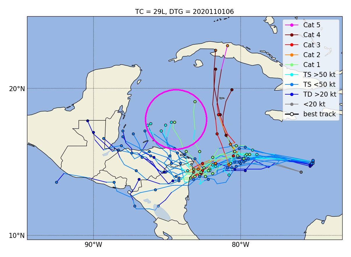 By day three the 06Z GFS shows Eta crawling ashore, then suddenly “jumping” well inland. That seems like convective feedback to me, especially given Zeta is likely to be a powerful system, intensifying as it nears Central America while slowing considerably. It is more likely that a strong Zeta would stall along the Honduran–Nicaraguan coastline or even execute a counterclockwise loop before reemerging over water. Yet some models show Zeta suddenly and unrealistically accelerating and heading inland after nearly stalling on the coastline while subject to weak steering currents all the while. I don’t buy that “inland” solution, personally.