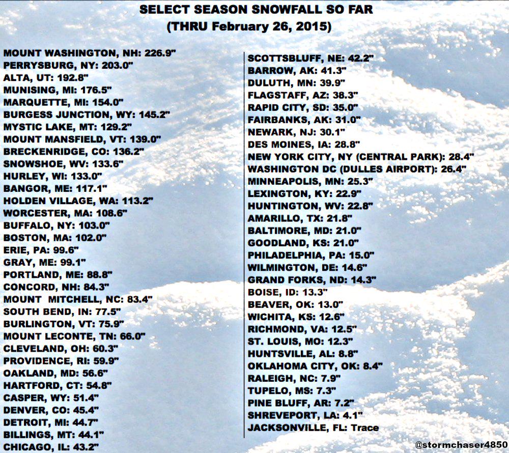 With respect to Portastorm and our friends in ATX, I hesitate to do this. But click on storm chaser Johnny Kelly's graphic link and check out the seasonal snow totals so far across dozens of U.S. cities including a few not too far away...