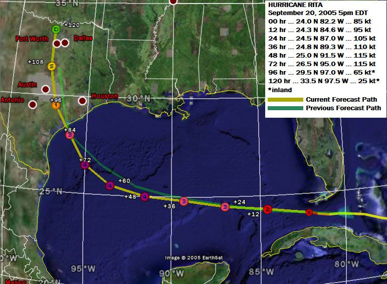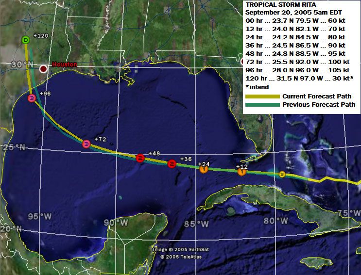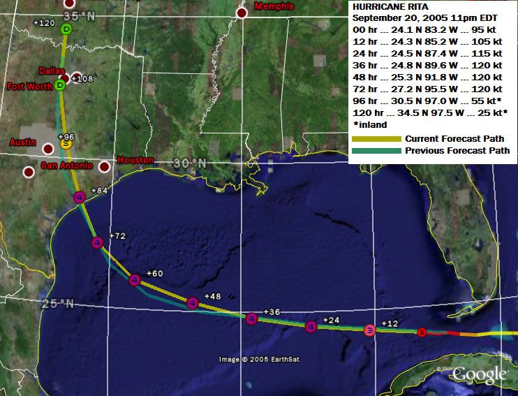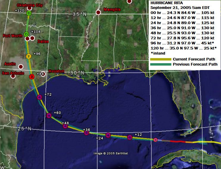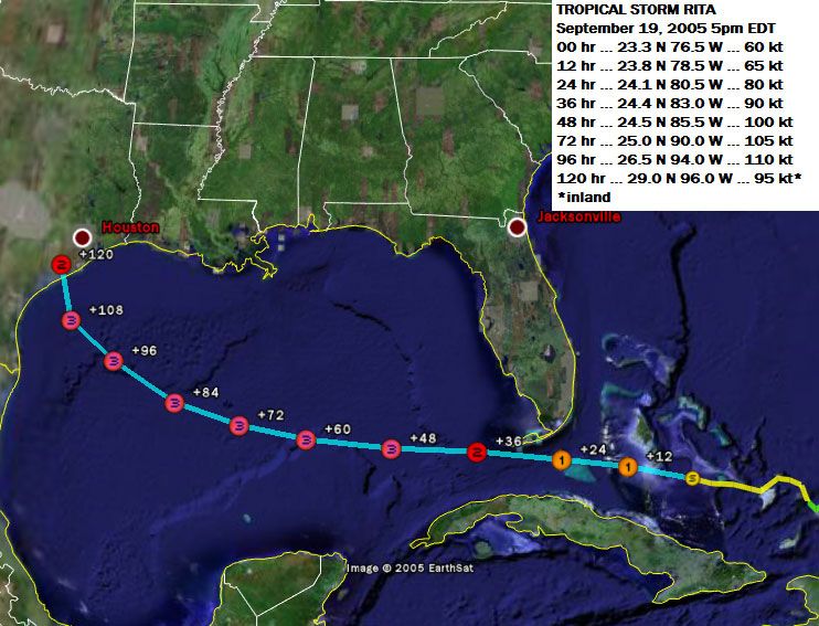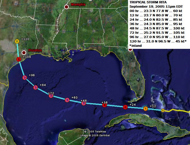 36 hours ago, I predicted the center of Rita to be at 24.5 N and 86.5 W in 12 hours, with an intensity of 90 knots. I was off just 20 statute miles in position, and 10 statute miles off in track. However, my intensity estimate was low by an astronomical 55 knots.