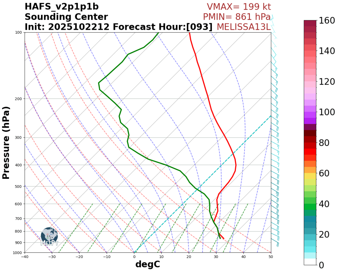 Here's the 12z experimental HAFSV2.1.1B, which went absolutely insane, the peak winds were in the sounding above at 199kts but the frame after the pressure dropped more to 859mb. I'm not sure what all's different from the operational or how well it has verified in the past (obviously it seems quite overcooked here) but it's been extremely bullish on Melissa for days.