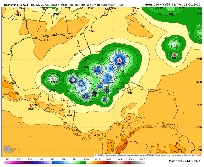 No sub-900 hPa ensemble members on the latest GDM-FNV run as far as I could tell (there have been one or two on many of the recent ones) but there are at least two that go below 910 & plenty more in the 920s and 930s. As one might expect, it's the member lows that track further west and slow or stall in the western Caribbean that tend to have the really low pressures, although there's a not-insignificant number that turn north sooner and still reach or approach MH intensity.