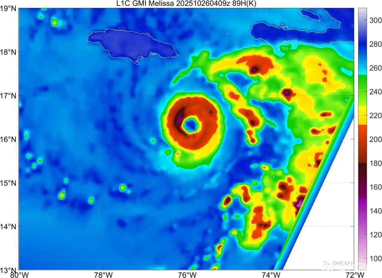 Neither Erin nor Humberto had a raw ADT fix of more than 7.1 at any point, and Ragasa's never got higher than 7.2; Melissa has now had seven in a row at 7.2 or higher. Granted, constraints are there for a reason, this obviously isn't a Category 5 yet, and cold cloud tops in the CDO can lead to exaggerated Dvorak values - but I still think it speaks to just how impressive the storm's overall appearance is.