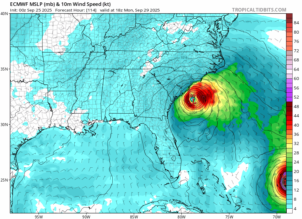 0Z Euro, just like the 0Z CMC, hits Georgetown, SC, on Monday evening though it isn’t as strong (989 mb per WxBell).